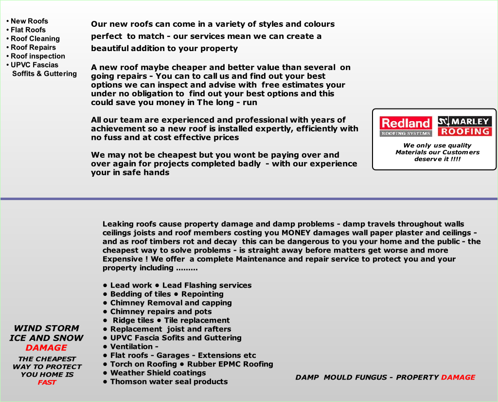 • Replacement     Beams  • New Felt  • New Tiles  • Guttering  • Down Pipes • Holes and leaks  • Roof inspection • Loft Insulation  • Roof Windows For all types of  Chimney Work, Ridges tiles   Including pointing and  Roof Repairs  These before and  after pictures show How we can protect  Your property